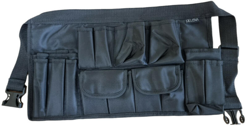 Professzionális sminkes eszköz és kelléktartó, mely derékra csatolható. A Deluva a professzionális stylist, sminkes, fodrász amerikai márkaneve. Az amerikai Deluva márka, mely arc és testfestőknek, sminkeseknek, kozmetikusoknak, fodrászoknak, stylistoknak készít jó minőségű, professzionális eszközöket, termékeket. A derékra csatolható eszköztartót úgy tervezték, hogy a leghatékonyabban és kényelmessebben elérhetőek legyenek az eszközök a munkák során. A sminkes eszköztaró öv 17 tartórésszel rendelkezik, melyből 4 tépőzárral zárható. Az öv állítható, így mindenki a magának megfelelő hosszúságra tudja beállítani a kényelmes használathoz. Anyaga erős, tartós szintetikus, ami könnyen tisztítható nedves ruhával. Méret: