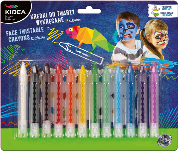 Arcfestő krétakészlet, 12 db-os, kitekerhető krétákkal, Kidea. Kréták praktikus műanyag fogórésszel.