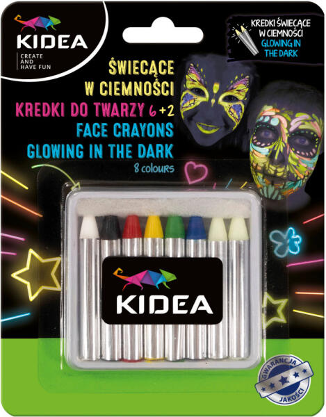 Arcfestő krétakészlet, 8 db-os, 2 db foszforeszkáló krétával, Kidea. A foszforeszkáló krétákkal igazán izgalmassá tehető az arcfestés. Indulhat a buli!