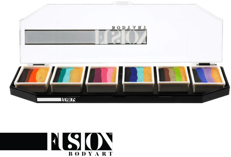 A Fusion Body Art Natalee Davies Gold Range palettája 6 darab 10 grammos mini csíkos arcfestéket tartalmaz: Tigress | Dragonfly | Fairy Blossom | Blue Wren | Fern | Violet