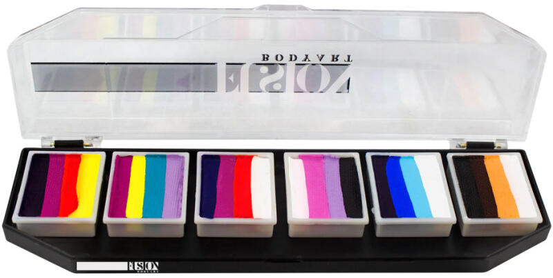 A Fusion Body Art Rainbow Splash palettája 6 darab 10 grammos mini csíkos arcfestéket tartalmaz: Sunset Glow - Tavaszi szivárvány - Sunrise Dreams - Gothic Girl - Frozen Queen - Furry Critters