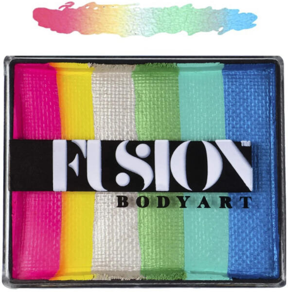 Fusion csíkos arcfesték Mermaid Tale 50 gramm Tökéletes trópusi mintákhoz, sellőalapokhoz Intenzív színű, magasan pigmentált, vízesbázisú professzionális arc és testfesték. Bőrbarát, professzionális minőségű festék. Tökéletes méret az egy-mozdulat technika ecsettel történő alkalmazásához, továbbá kitünően használható a szivaccsal való munkákhoz egyaránt. A Fusion csíkos arcfesték Mermaid Tale a következő színeket tartalmazza: Pink Sorbet, Prime Light Yellow, Pearl White, Pearl Lime, Pastel Blue Green, Pearl Blue