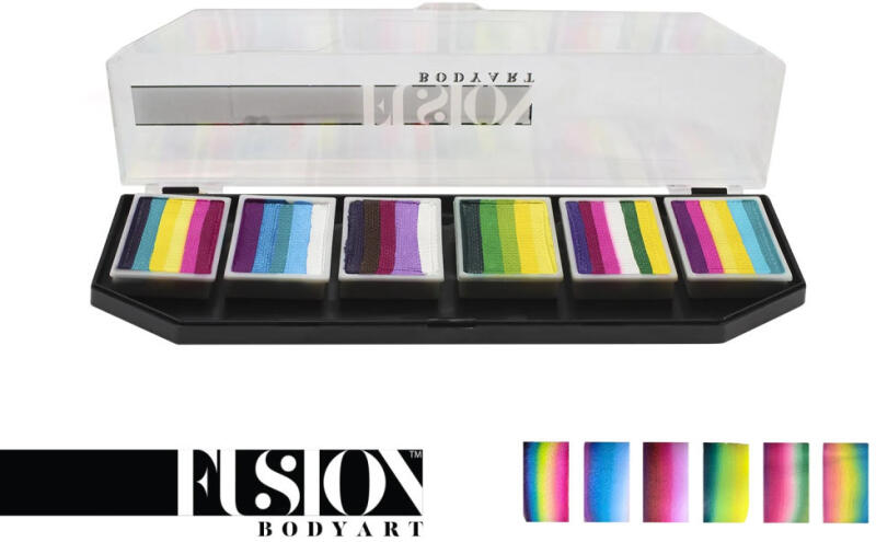 A Fusion Body Art Rainbow Burst Spectrum palettája 6 darab 10 grammos mini csíkos arcfestéket tartalmaz: Leanne’s Rainbow Magic, Leanne’s Indigo Princess, Leanne’s Gypsy Rose, Leanne’s Secret Garden, Leanne’s Spring Fairy and Leanne’s Rainbow Flower
