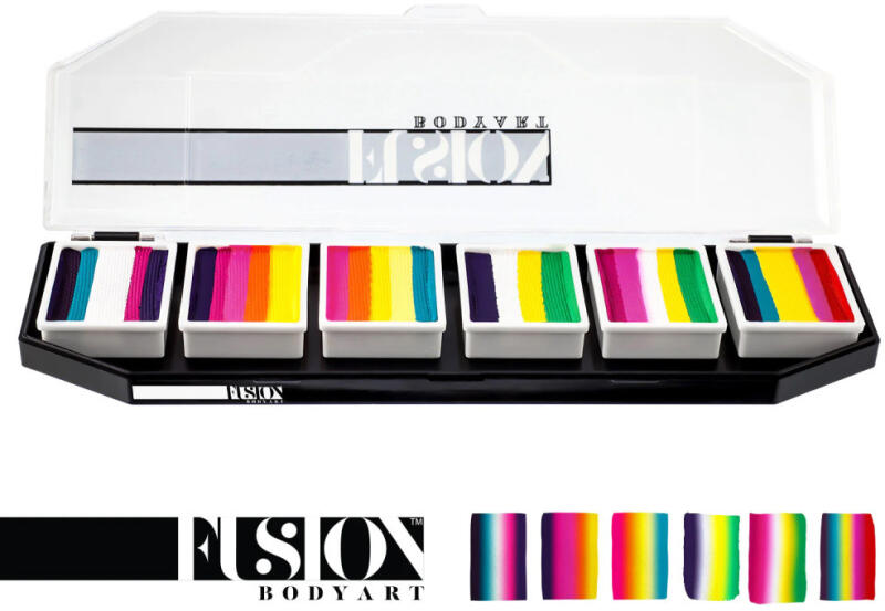 A Fusion Body Art Trópusi kollekció palettája 6 darab 10 grammos mini csíkos arcfestéket tartalmaz: Fancy Eye's | Nirvana | Summer Day's Leanne's Purple Pixie | Leanne's Flower Fairy | Leanne's Rainbow