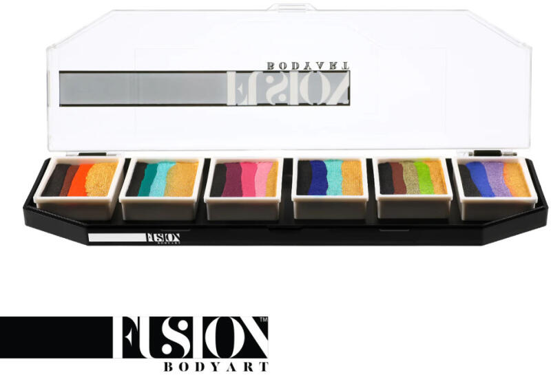 A Fusion Body Art Natalee Davies Gold Range palettája 6 darab 10 grammos mini csíkos arcfestéket tartalmaz: Tigress | Dragonfly | Fairy Blossom | Blue Wren | Fern | Violet