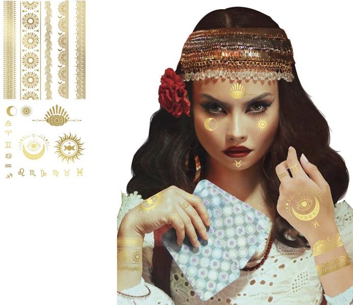 Tetoválás készlet - Arany médium A   farsangi   vagy   Halloween jelmeze   hitelesebbnek tűnhet az olyan   kiegészítőknek   köszönhetően, mint például ez az arany színű   tetoválás készlet .